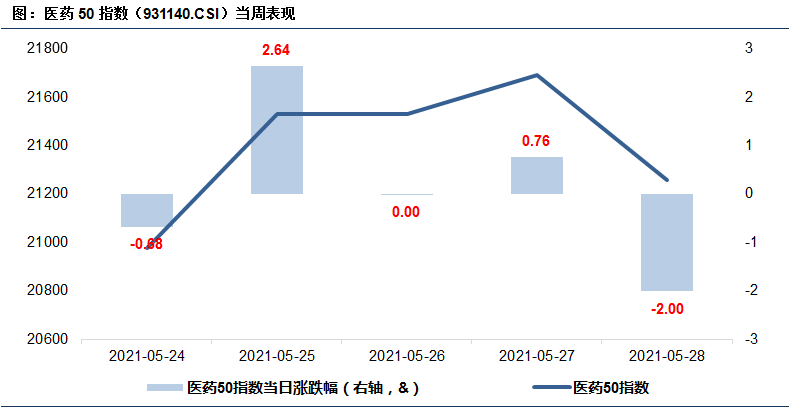 5月24日至5月28日,医药50指数(931140.CSI)呈现高开低走格局,本周涨幅0.66%,跑输沪深300指数2.98%。
