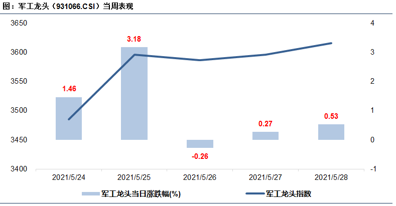 上周军工龙头指数周中大幅上扬,除周三外其余四天均上涨。其中,周一、周二涨幅较大,分别上涨1.46%、3.18%。上周指数涨幅为5.26%,同期沪深300涨跌幅为3.64%,跑赢沪深300指数1.62%。