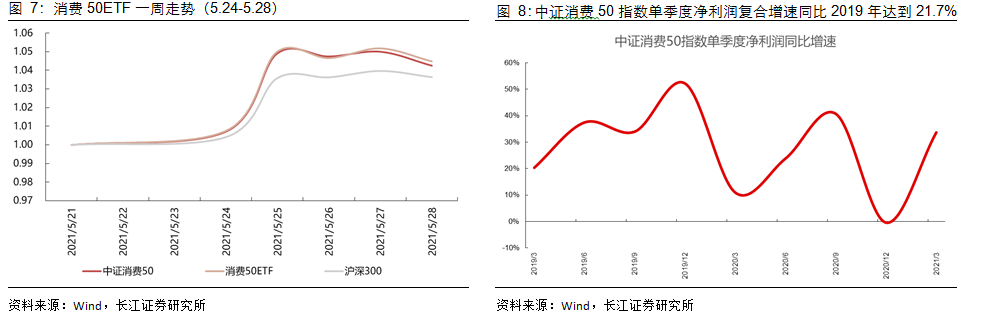 年报方面,消费50指数净利润同比增速为17.66%;一季报方面,消费50指数整体的净利润(2019年为基准)复合增速为21.74%。
