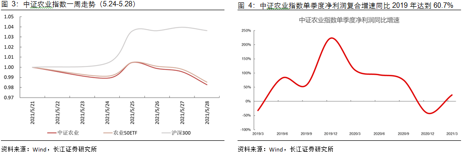 年报方面,中证农业整体的净利润同比增速为39.59%;一季报方面,中证农业整体的净利润(2019年为基准)复合增速为60.74%。