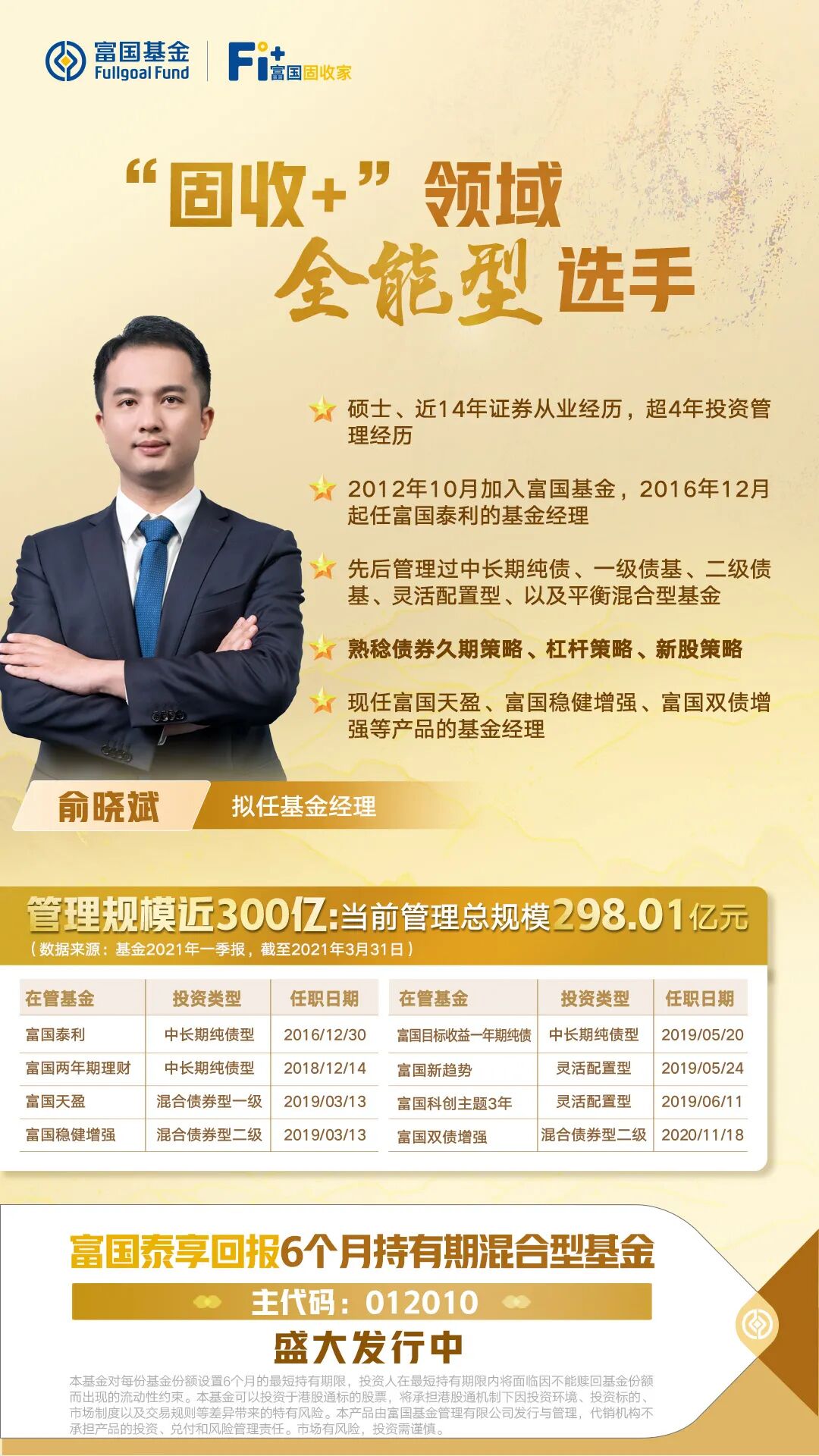 富二家当下正在发行的新产品:富国泰享回报6个月持有期(主代码:012010)的拟任基金经理俞晓斌就是这样一位难能可贵的“固收+”领域全能型投资经理,目前管理多只产品。基金2021年一季报数据显示,俞晓斌目前管理规模接近300亿。