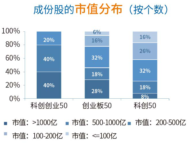 科创创业50指数成份股市值主要集中于1000亿以上,占比达40%;成份股行业则主要集中在医药生物、电子,占比达60%。