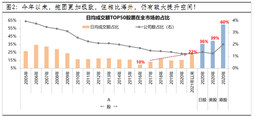 首先,中国已进入存量经济时代,更多是如何切分和争夺蛋糕的问题,而在存量博弈下,强者恒强的趋势也就成为必然。其次,“买龙头”是市场的选择,我们所看到的是,自2017年以来,公募基金持仓的前20只股票市值占比已从14%升至37%(数据来源:wind,截至2021-6-4),资金不断向优质企业聚集。再者,A股虽然行情极致分化,但相比日股、美股、港股,“抱团”的极致程度仍有很大提升空间。