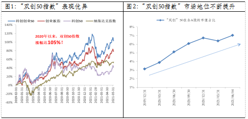 那么到底什么是“双创50指数”?其全称是“中证科创创业50指数”,是从科创板和创业板中选取市值较大的50只新兴产业公司作为指数样本,而且会季度调整成分股,所以说,“双创50指数”也是一只不断进化的指数。根据wind统计,自2020年以来,双创50指数的累计涨幅达105%,远远超过创业板指(80%)、科创50(47%)、纳斯达克指数(57%),表现尤为亮眼;其次,双创50成分股在全A股的市值占比已从2019年底的3%快速跃升至当前的7%,市场地位愈发凸显。
