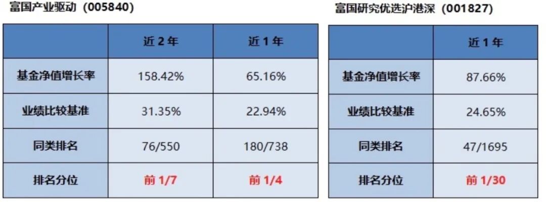 此外,厉叶淼管理的富国产业驱动(005840)、富国研究优选沪港深(001827)的业绩表现同样不俗,大幅超越业绩基准不说,近年收益率同类排名也一直处于中上游。