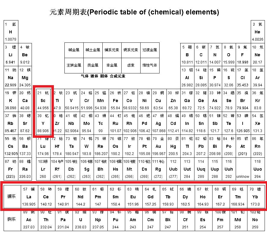 稀土是十七种元素的统称,即镧系元素(15种)+钪、钇。在我们中学的化学元素周期表上,它们是从来都不会被要求背下来的那一簇——