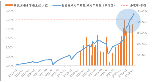 数据来源:wind,截至2021-06-30;其中新能源汽车销量为右轴