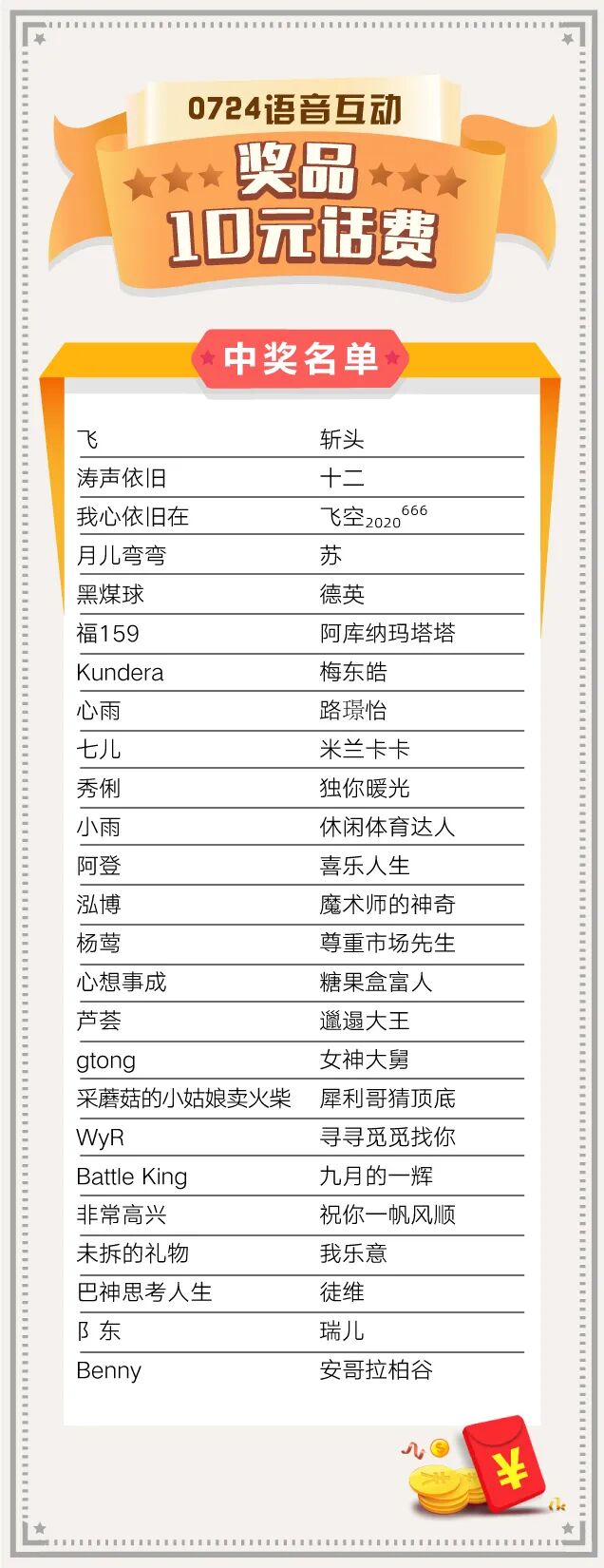 话费将于7月30日(本周五之前)充值到中奖客官后台预留的手机号码中,请各位客官耐心等待~
