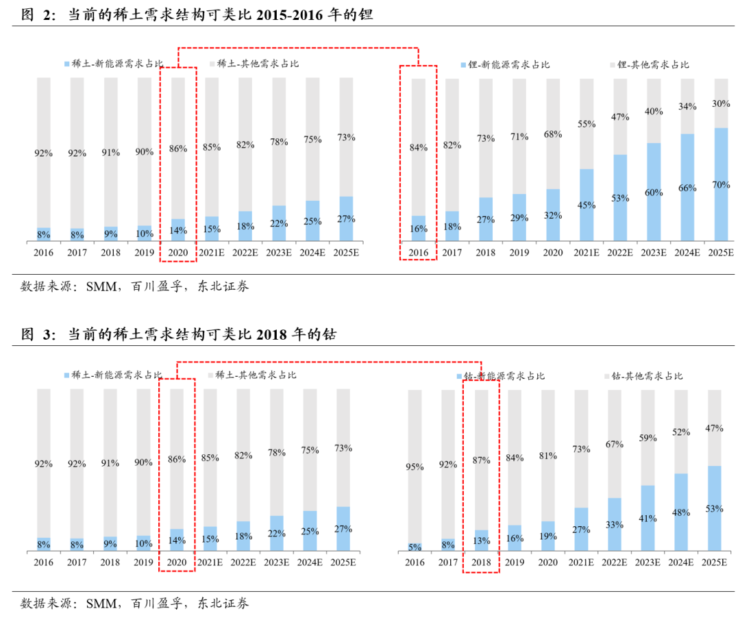 目前稀土的下游需求中,约14%用于新能源。这可类比于2015年-2016年的锂,彼时锂的下游需求中,新能源的占比约15%;和2018年的钴,下游需求中新能源占比约13%。