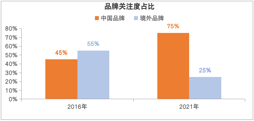 首先,何为“国潮”?所谓“国潮”,顾名思义就是“国风+潮流”,但它已不局限于新国货,而是以品牌为载体,以文化为语言的一种现象。根据《2021国潮骄傲搜索大数据》,中国品牌的关注度已经从2016年的45%提升至2021年的75%,不可否认的是,中国品牌在崛起。