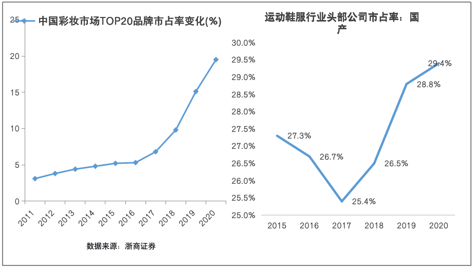 👀 视角一:以化妆品、运动鞋服为例,彩妆市场中,国产品牌的市场份额从2016年的 5%快速提升至2020年的20%,而运动鞋服市场中,头部国产品牌的市占率自2018年以来重回上升通道,2020年达到29%。所以整体而言,国潮崛起势不可挡,且未来仍有巨大发展空间。