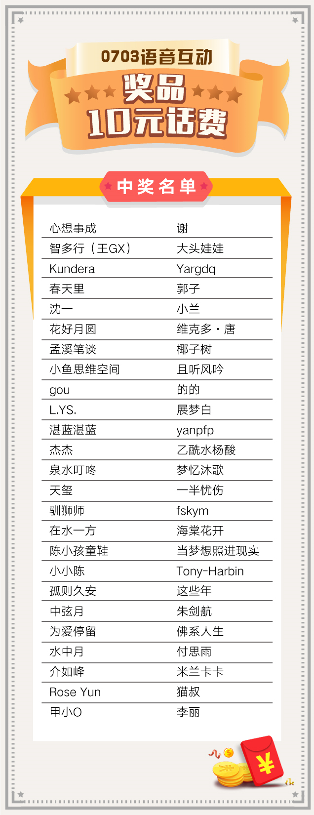 话费将于7月9日(本周五之前)充值到中奖客官后台预留的手机号码中,请各位客官耐心等待~