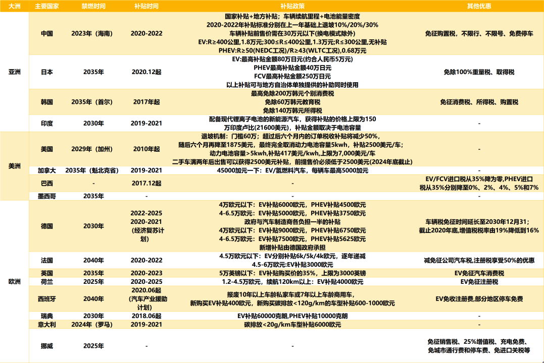 图表1:全球燃油车禁售及新能源补贴政策梳理