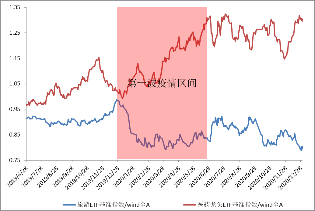 图:旅游ETF基准指数、医药龙头ETF基准指数和wind全A的比值