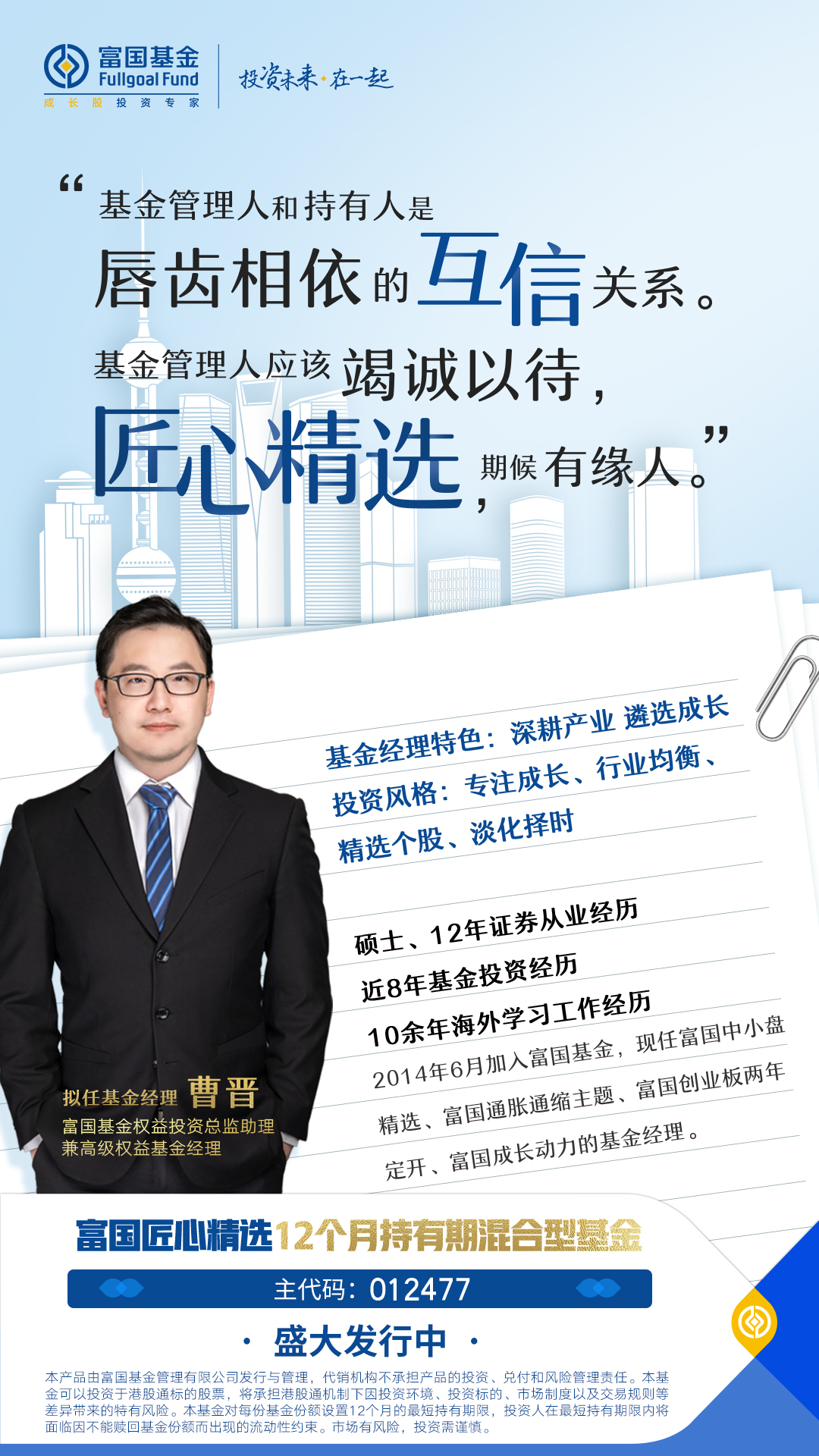 作为曹晋多年投研积淀的集大成之作,新产品富国匠心精选12个月持有期(主代码:012477)将秉承曹晋的投研理念,立足产业周期,均衡配置科技、医药、消费、新能源等板块,臻选估值合理的优质成长股。感兴趣的客官可以点击下方“阅读原文”了解更多,也可以于工商银行、中国银行等各大银行、券商及三方渠道,搜索富国匠心精选,或者代码012477找到~
