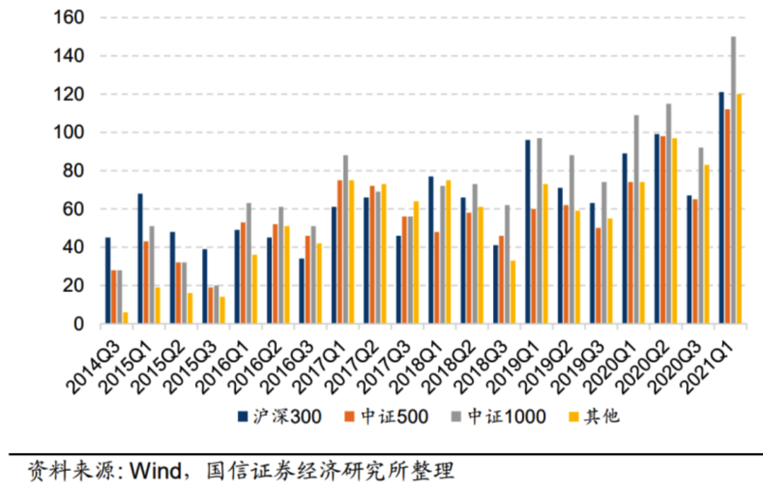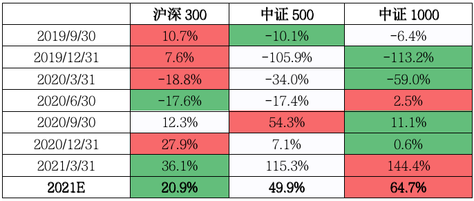 如果再从更微观的个股角度来看,国信证券金工团队统计了各个指数里业绩超预期个股的数量分布,发现2021Q1的灰色柱子出现了大幅跃升,且“鹤立鸡群”于整个图中。而这个灰色柱子,就是中证1000的情况。