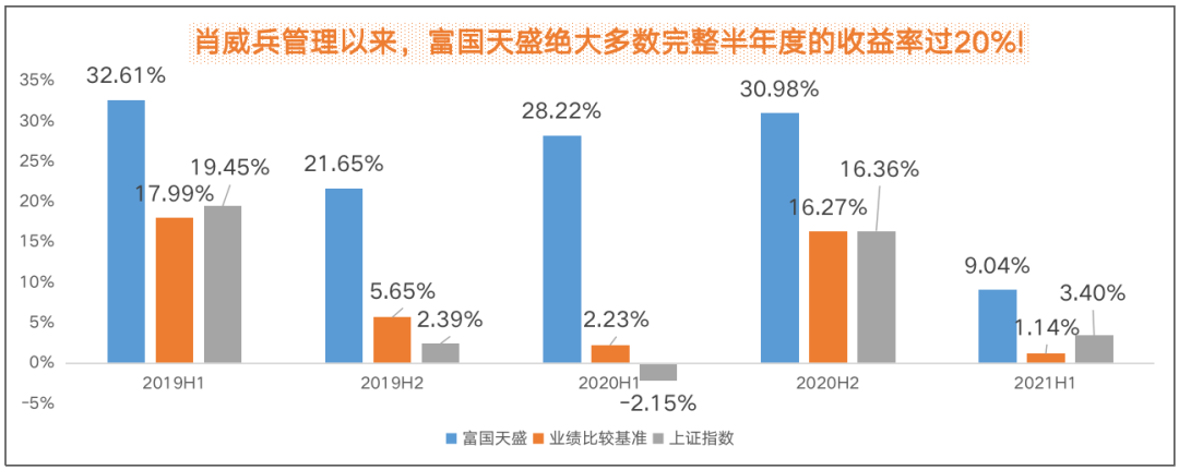 注3:富国天盛(2014年4月30日成立)2016-2020年度及2021年上半年基金份额净值增长率与其同期业绩比较基准(沪深300指数收益率×65%+中债综合指数收益率×35%)收益率分别为-10.63%(-6.37%)、29.16%(13.89%)、-18.89%(-14.51%)、61.32%(24.65%)、67.94%(18.86%)、9.04%(1.14%),数据来源∶基金定期报告,截至2021年6月30日。该业绩区间内袁宜自2014年4月至2018年9月担任本基金基金经理,肖威兵自2018年9月开始担任本基金基金经理。