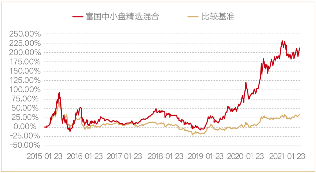 2、富国中小盘精选区间收益率、评级及同类排名情况来自海通证券,同类类别为主动混合开放型-强股混合型,同期业绩比较基准收益率数据来自Wind,截至2021年6月30日;富国中小盘精选(2015年1月23日成立)2016-2020年度基金份额净值增长率与其同期业绩比较基准收益率(中证700指数收益率*80%+中债综合财富指数收益率*20%)分别为-27.29%(-13.45%)、29.81%(2.72%)、-34.09%(-25.59%)、71.40%(26.29%)、83.69%(23.06%)。数据来源:基金定期报告,截至2020年12月31日。