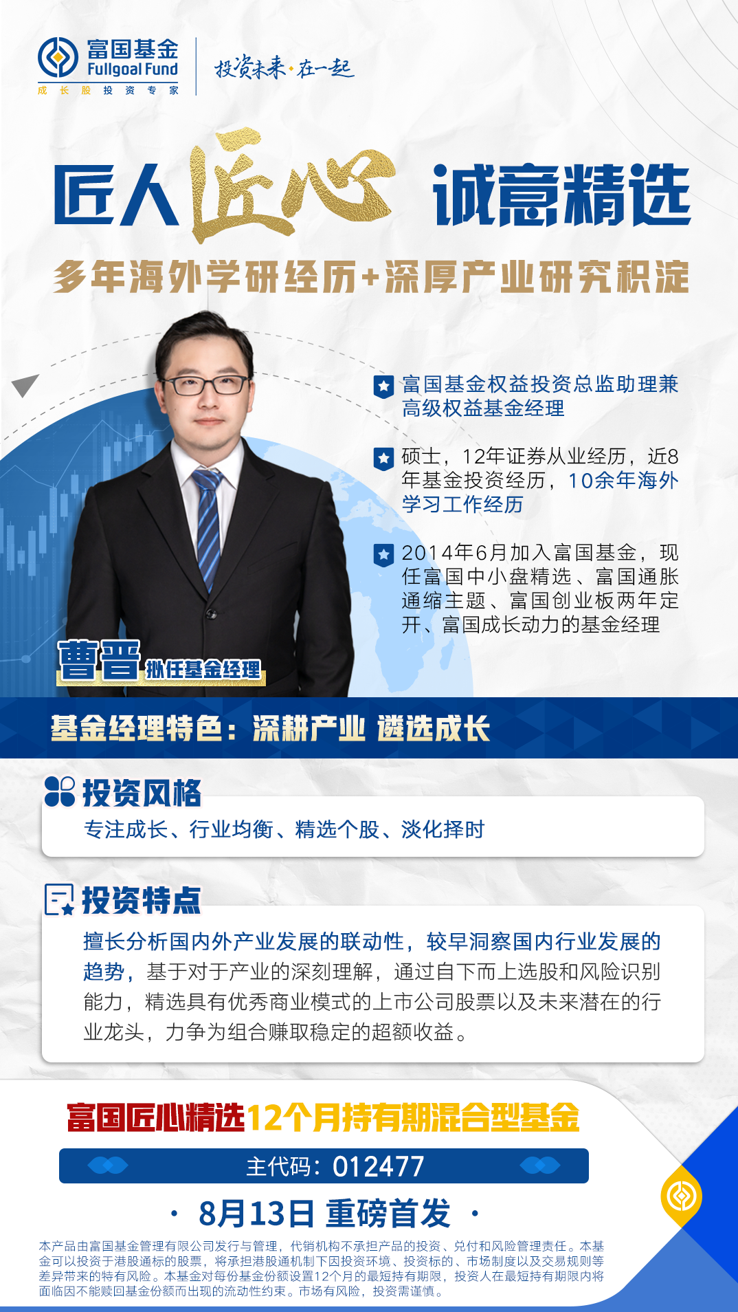 8月13日,拟由曹晋管理的富国匠心精选12个月持有期(A类:012477;C类:012478)即将首发,新产品秉承曹晋的投研理念,拟聚焦产业趋势和龙头优势,精选A+H两地具有良好成长性的绩优股票,重点关注行业包括但不限于科技、消费、医药、新能源等,通过较为均衡的行业配置,以期为持有人打造波动较小的投资体验。