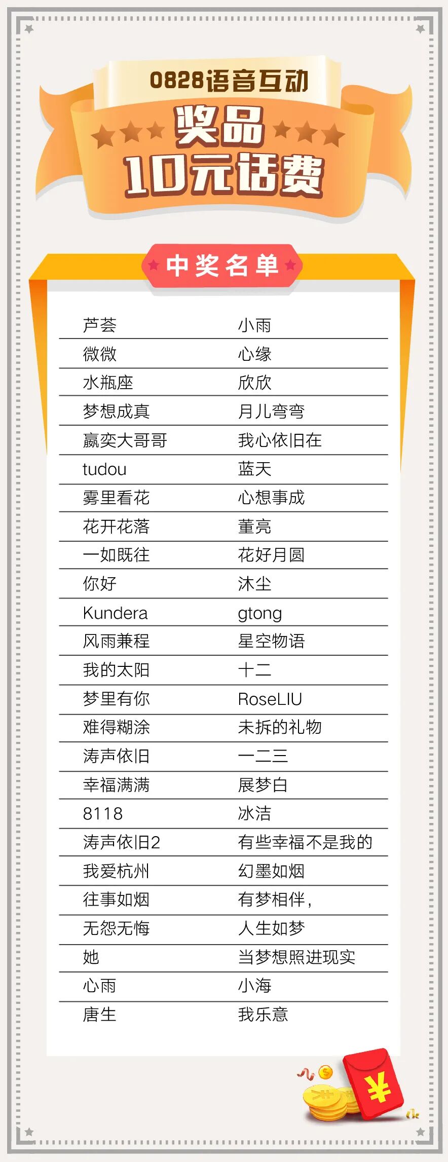 话费将于9月3日(本周五之前)充值到中奖客官后台预留的手机号码中,请各位客官耐心等待~