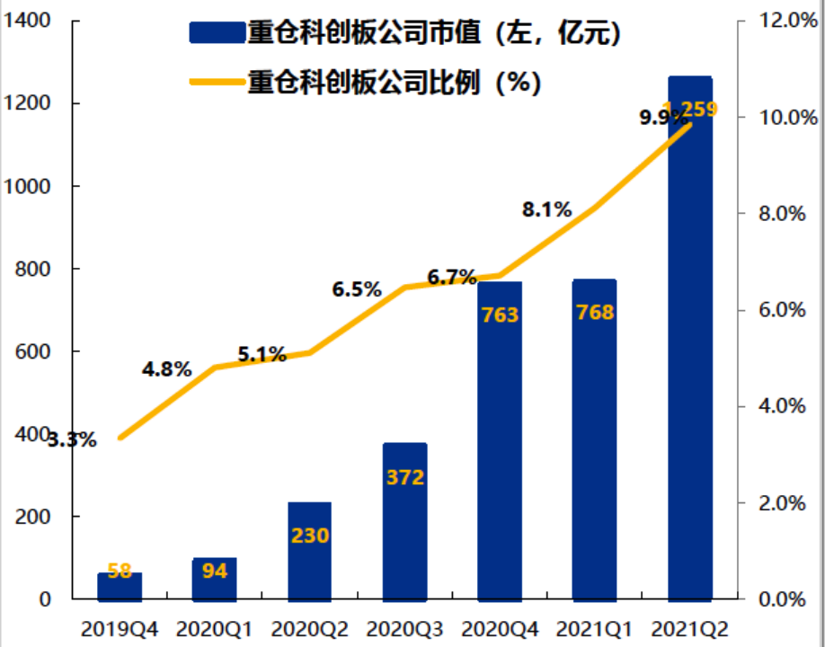 以公募基金为例,2019年以来,主动权益性基金持续加仓科创板,截至2021年二季报,公募基金重仓科创板公司市值达到了1259亿元,重仓比例也从2019年Q4的3.3%到如今的9.9%,体现了机构投资者对于科创板投资价值充分的认可。
