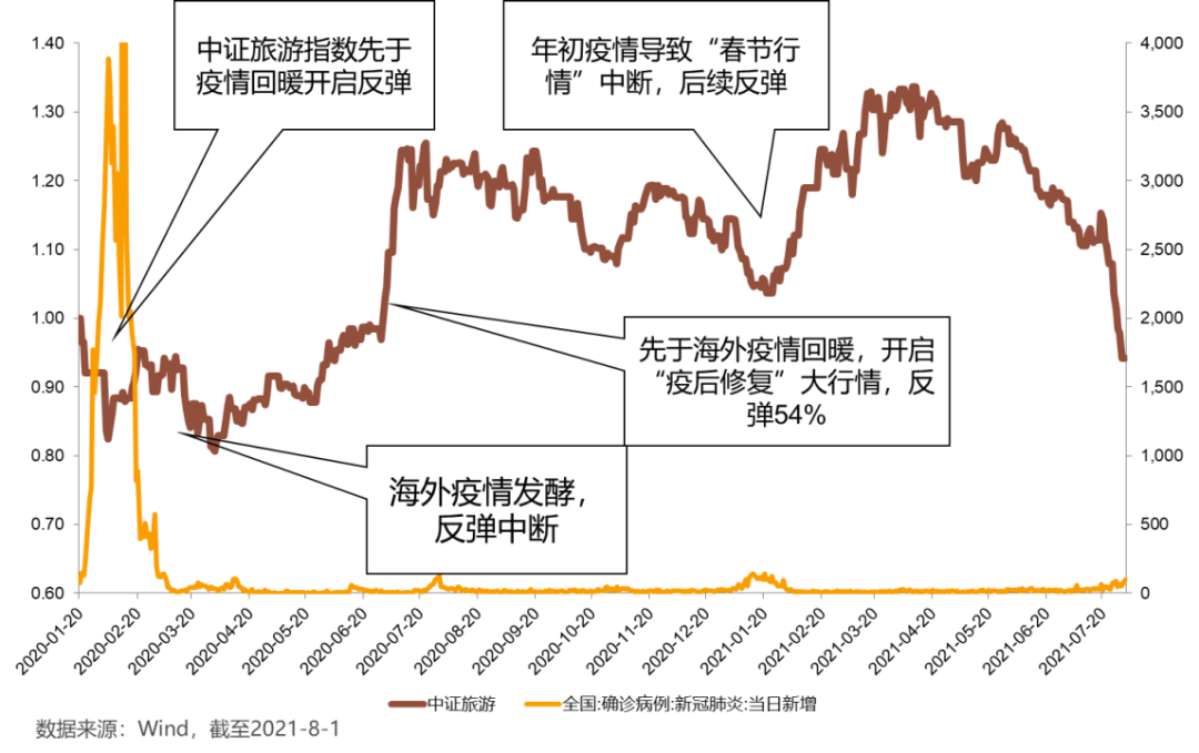 图:2020年以来中证旅游指数走势与国内新增病历情况