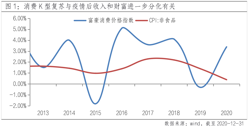 众所周知,改革开放以来,中国经济实现了30年经济高速增长,但随着经济增速换挡,一些结构性问题开始逐步显现。尤其疫情之后,居民收入复苏不平衡,贫富差距进一步扩大,一定程度拖累了消费和经济复苏的步伐。从价格上看,2020年富豪价格指数同比从2019年的-0.3%上升到3.4%,而总体非食品CPI则从2019年的1.4%回落到2020年的0.4%,消费K型复苏从侧面反映了当下不少人的生存压力和“躺平”思潮。因此,当经济从“高速增长”迈向“高质量发展”阶段,需要再次审视和正确处理效率与公平的关系,促进共同富裕,不仅关乎民生福祉,也关乎进一步释放生产要素潜力。