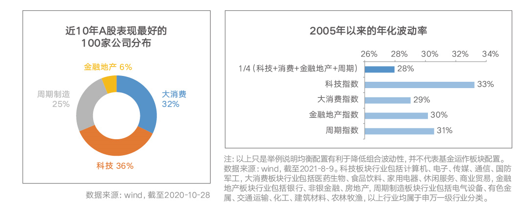 从历史数据来看,相比于单一风格的投资,均衡配置有助于降低组合波动性,提升投资者的投资体验。从近10年A股表现最好的100家公司来看,四大板块的每个行业都能孕育出优秀的公司,适当均衡能降低组合波动性但也不乏进攻力。