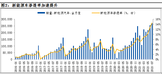 对于新能源汽车这个新兴产业而言,渗透率水平决定着当前的起点位置和未来的行业格局。据乘联会数据,7月底国内新能源汽车渗透率已经达到14.5%,仅仅从绝对数字或难感受到行业发展的迅速。更为直观的是与过去进行对比,会发现新能源车渗透率从2016年6月的2%提升至2018年11月的6%,经历了2年多的时间,从2018年11月的6%提升至2021年5月的10%,经历了近3年时间,而从2021年5月的10%提升至2021年7月的14%仅用了2个月。由此可见,新能源车渗透率已经熬过了初创期的漫长艰苦岁月,进入到依靠行业自驱力加速渗透阶段。