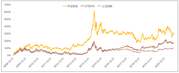 旅游ETF(159766)是当前市场上唯一一只追踪中证旅游指数(930633.CSI)的基金,目前,主要成分股的市值整体较高,分布介于沪深300与中证500之间,属大中盘风格。指数的历史业绩方面,中证旅游指数自2008年12月31日基期以来累计回报283%,同期沪深300涨幅165%,上证指数涨幅99%。对于指数收益率图的对比,客官肯定不陌生,一般来说沪深300是比较难超越的,能跑赢沪深300的指数,其选股是有一定优越性的。