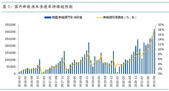 根据中汽协数据,8月国内新能源车销量为32.10万辆,渗透率为17.84%,渗透率单月+3.32%,较6月、7月分别+2.47%、+1.83%加速攀升,新能源车渗透率“J”型增长到来,全年销量预期已经从2月的180万辆上修至现在的320万辆,7、8月渗透率持续超预期。新能源车销量高增,其对上游原材料需求也超预期增长,因此伴随7、8月新能源车销量攀升,上游的锂、稀土供不应求,短期价格快速上升,从而带动了锂、稀土等“新周期”的投资机遇。