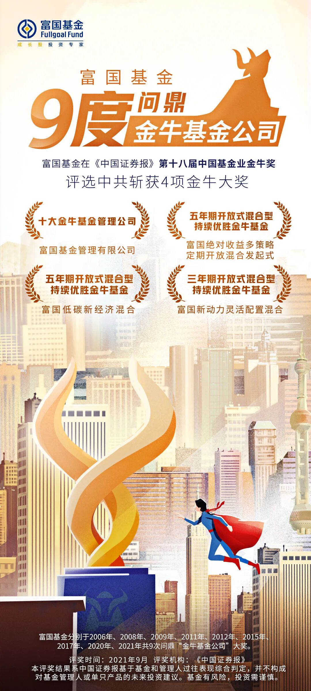 这是富国基金继2006年、2008年、2009年、2011年、2012年、2015年、2017年、2020年后第九次问鼎“金牛基金公司”大奖~