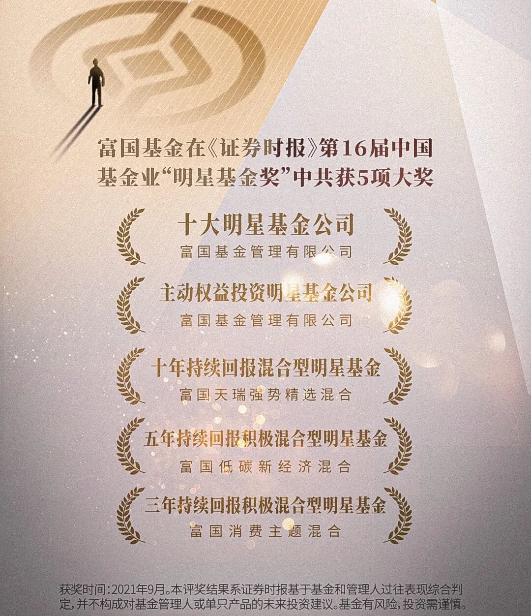 一般来说,每个奖项的年度“基金公司”大奖可是最具含金量的奖项,反映了基金公司近年投研的整体实力。今年富二家实现了业内鲜少出现的,三大报公司奖的“大满贯”。而此次获得“十大明星基金公司”的殊荣,也是富二家历史上第6次获得此荣誉。(注:富国基金分别在2007、2012、2016、2018、2020、2021年获得“十大明星基金公司” 奖)