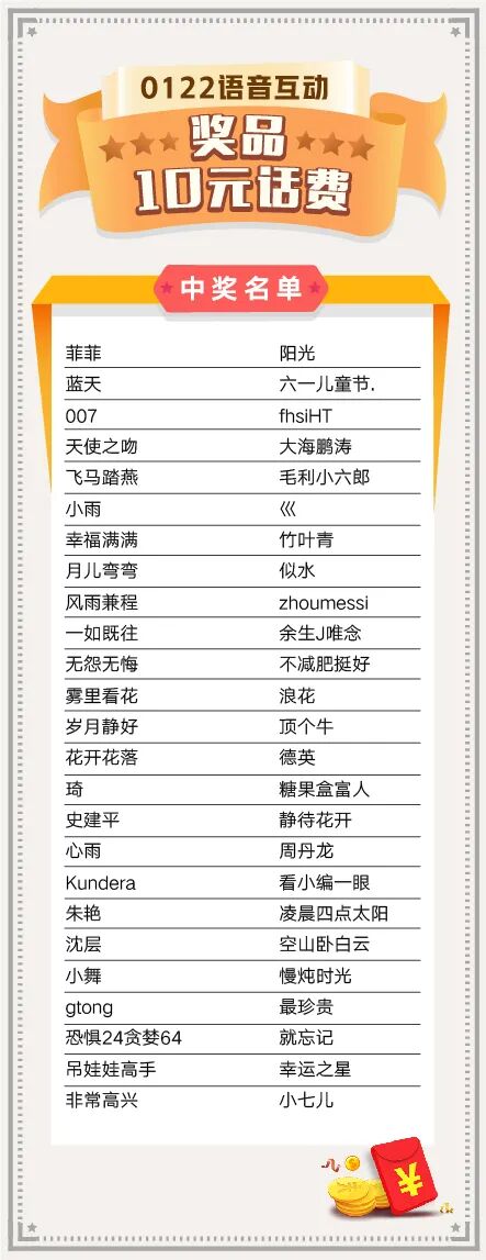话费将于1月28日(本周五之前)充值到中奖客官后台预留的手机号码中,请各位客官耐心等待~