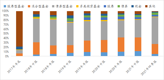 数据来源:wind,截至2021-12-31;其中2021年四季报各大类基金占比按照重仓基金测算