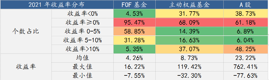 不同于主动权益基金及A股市场个股的表现,FOF基金在2021年呈现出“稳健”的业绩表现,2021年FOF基金收益率均值4.26%,其中95%以上的FOF基金收益率均为正。