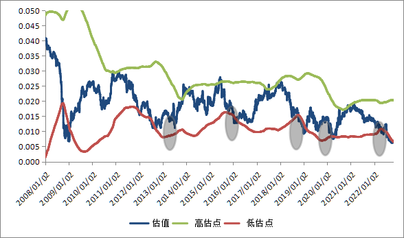 最近很多家券商的首席策略分析师反复聊一个逻辑:每当股市估值(下图中的蓝色线)跌到红色虚线(低估线)的位置,股市继续杀跌的风险往往有限。因为这时候,股市已经反映了最悲观的预期,空头持续卖出、尽情发泄悲观情绪之后,股市继续砸盘的资金变得很有限,“赔率”变高。