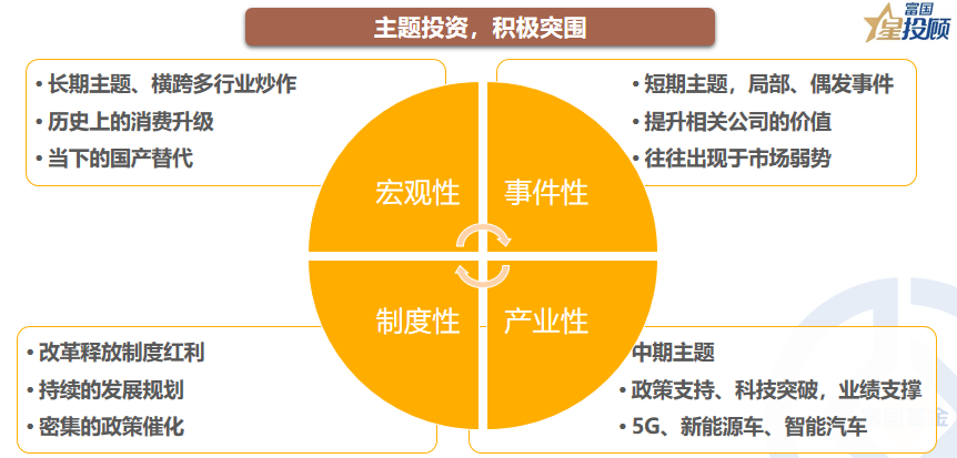 积极突围,不妨主题投资。主题投资可能是跨行业、跨板块、跨品种的机会。在当前市场,沿着宏观性、事件性、制度性、产业性四个维度,数字经济、自主可控、能源安全,或者值得中长期突围的主题。