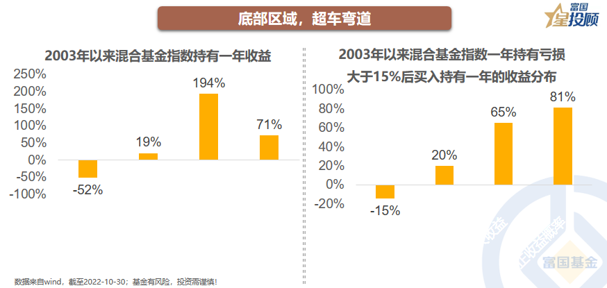 底部区域,超车弯道。熊市,是容易悲观的季节,但同样是乐观者“超车”的弯道。2003年以来,混合型基金指数一年持有收益率均值19.39%(截至2022-10-30),一年持有正收益的概率71.43%。