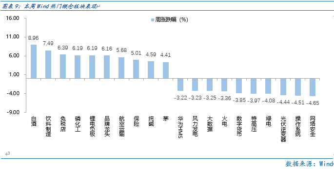 国务院联防联控机制综合组发布新冠疫情防控措施“新十条”后,消费板块和医药行业呈现结构性机会。从Wind热门概念板块来看,表现相对靠前的是白酒(8.96%)、饮料制造(7.49%)、免税店(6.39%)、磷化工(6.19%)、锂电负极(6.19%);表现相对靠后的是网络安全(-4.65%)、操作系统(-4.51%)、光伏逆变器(-4.44%)、绿电(-4.08%)、特高压(-3.97%)。