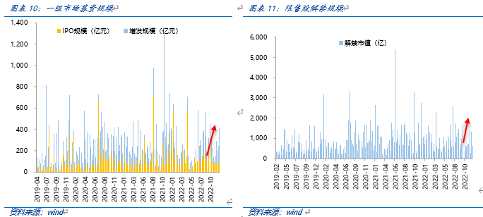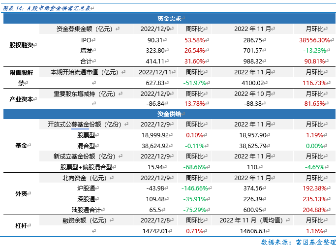 资金需求方面,本周一级市场规模有所减少,限售股解禁压力下行,重要股东增持。本周一级市场资金募集金额合计414.11亿元,较上周增加31.60%;结构上,IPO募集90.31亿元,周环比增加53.58% ;增发募集323.80亿,周环比增加26.54% 。本周限售股解禁规模合计627.83亿元,周环比减少51.97%,根据目前披露的数据,预计下周解禁规模约3109.65亿元,解禁压力有所下行。本周重要股东减持627.83亿元,上周减持69.79亿元。
