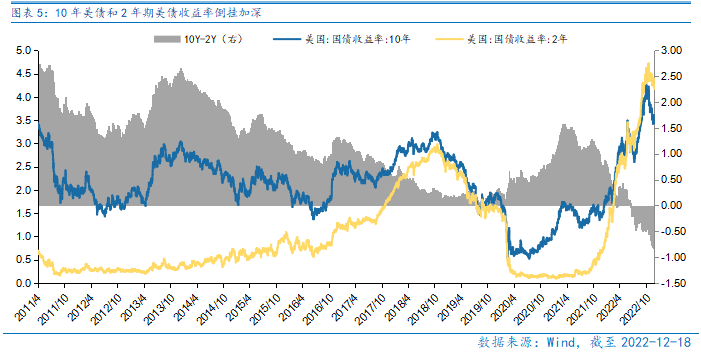 美国12月加息50bp落地,由于前期美股涨幅较大,落地后部分资金获利兑现,美股或先抑后扬。12月美联储议息会议如期加息50bp,未来2月、3月均分别加息25bp,市场对美联储加息节奏充分预期,但前期美股如道指涨超20%,涨幅较大,部分资金在加息落地后获利兑现,且10年美债和2年期美债收益率倒挂加深,市场开始担忧明年美国经济的衰退风险,短期美股或先抑后扬。