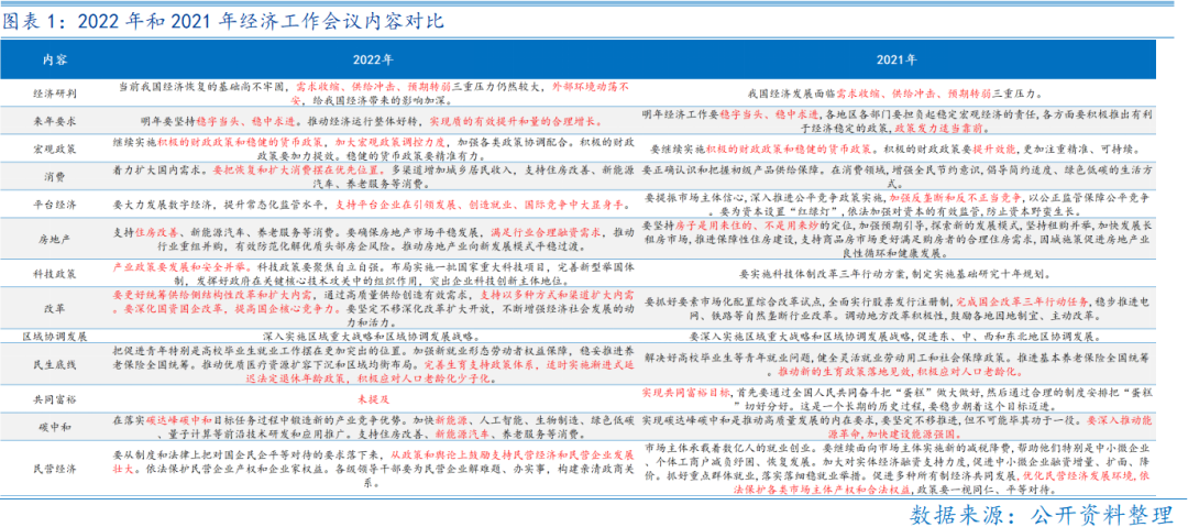 在具体政策上经济工作会议提出了一些指引。关于消费,提出“要把恢复和扩大消费摆在优先位置”;关于房地产,将“住房改善”放在消费的首位,且提出“满足行业合理融资需求,推动行业重组并购”,2023年地产商的融资环境有望改善,但销售端复苏仍有待观察;科技政策上,提出“发展和安全并举”,预计2023年“安全”主题投资仍值得关注;改革上,提出“要更好统筹供给侧结构性改革和扩大内需”,首次将供给侧改革和扩内需相结合,并提出“要深化国资国企改革,提高国企核心竞争力”,预计对当前央企重估的行情有一定支撑;在民生方面,首次提出“适时实施渐进式延迟法定退休年龄政”;碳中和方面,主要以发展新能源的产业竞争优势为主;民营经济方面,提出“从政策和舆论上鼓励支持民营经济和民营企业发展壮大”,且本次会议未提及“共同富裕”的内容,此论述缓解前期社会的担忧,对民营企业家的信心提振力度大。