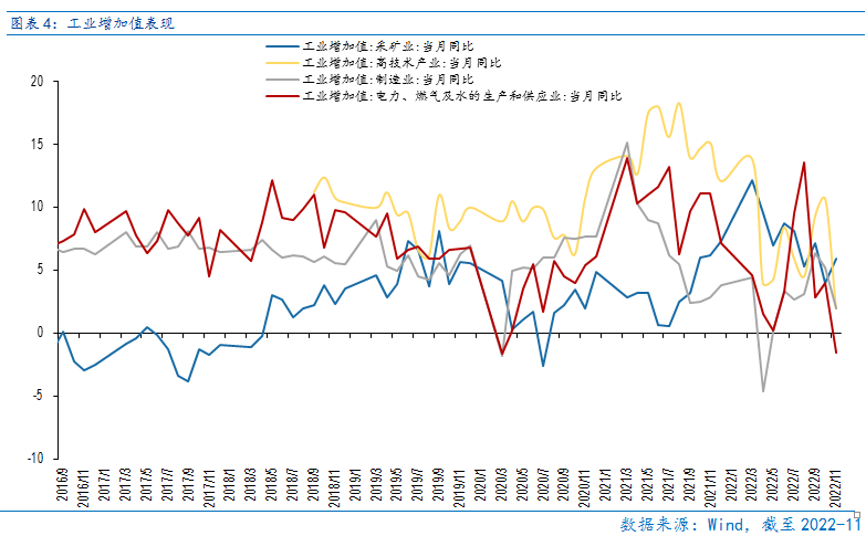 11月社零同比-5.9%,较10月的-0.5%大幅回落;结构上,除粮油和药品类零售实现正增长外,其他项均负增长。11月固定资产投资累计同比5.3%,读数为今年最低;其中由于“稳增长”政策发力,基建投资累计同比11.65%继续回升;高新技术产业投资累计同比13.2%,为7月以来最低;虽然“地产三支箭”齐发,但政策见效仍需时间,房地产开发投资额累计同比持续回落,11月累计同比-9.8%,为今年最低。工业增加值而言,11月制造业、高技术产业、电力燃气水工业增加值同比分别为2%、2%和-1.5%,读数均较上月回落,仅采矿业受益于冬季能源需求回升,工业增加值同比5.9%,较上月回升。