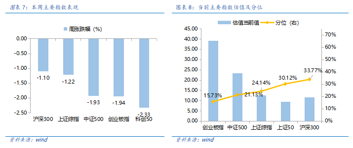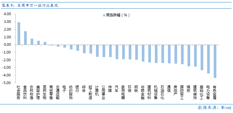 近一周,上证指数下跌1.22%,创业板指下跌1.94%,沪深300下跌1.1%,中证500下跌1.93%,科创50下跌2.33%。风格上,消费、稳定表现相对较好,周期、成长表现较差。从申万一级行业看,表现相对靠前的是社会服务(2.92%)、食品饮料(1.75%)、农林牧渔(0.8%)、美容护理(0.51%)、医药生物(0.36%);表现相对靠后的是有色金属(-4.33%)、电力设备(-3.77%)、基础化工(-3.35%)、建筑装饰(-2.89%)、煤炭(-2.83%)。
