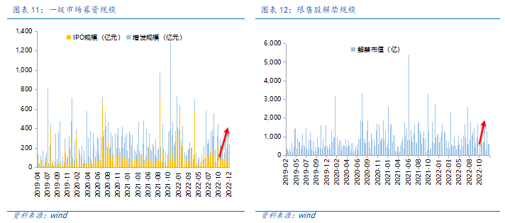 资金需求方面,本周一级市场规模有所减少,限售股解禁压力上行,重要股东增持。本周一级市场资金募集金额合计238.42亿元,较上周减少45.22% ;结构上,IPO募集101.41亿元,周环比增加53.58% ;增发募集323.80亿,周环比增加13.33% 。本周限售股解禁规模合计601.81亿元,周环比减少53.96%,根据目前披露的数据,预计下周解禁规模约1139.53亿元,解禁压力有所下行。本周重要股东减持601.81亿元,上周减持627.83亿元。