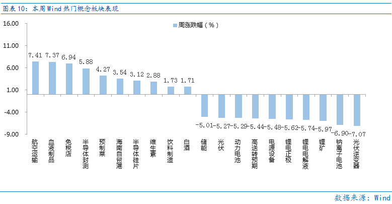 在防疫优化的大背景下,消费板块未来的复苏预期较强,在市场交易“预期”的背景下,消费板块持续受到资金青睐。从Wind热门概念板块来看,表现相对靠前的是航空运输(7.41%)、血液制品(7.37%)、免税店(6.94%)、半导体封测(5.88%)、预制菜(4.27%);表现相对靠后的是光伏逆变器(-7.07%)、钠离子电池(-6.9%)、锂矿(-5.97%)、锂电电解液(-5.74%)、锂电正极(-5.62%)。