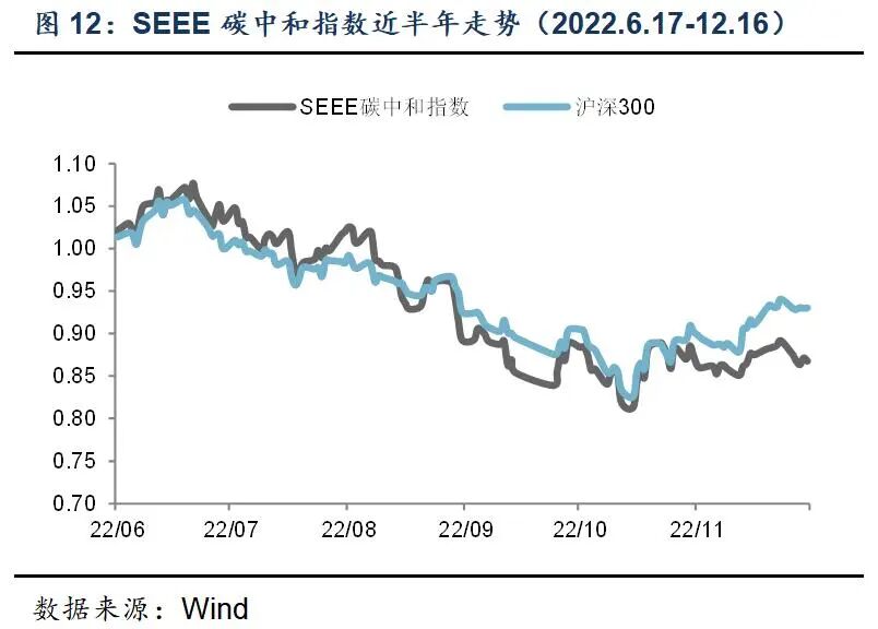 近半年表现回顾:SEEE碳中和指数近半年的收益率为-13.2%,跑输沪深300的-7%。