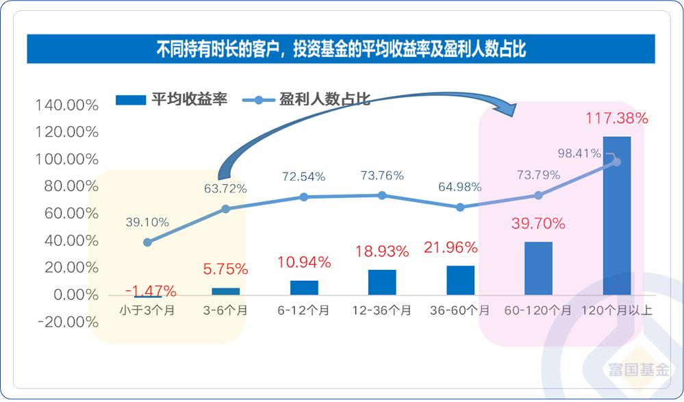 根据《公募权益类基金投资者盈利洞察报告》,不同持有时长的客户,持有时间越长,获得的平均收益率更高、获得盈利的人数占比也越高,以持有36—60个月(3至5年)为例,平均收益率达21.96%,盈利人数占比达64.98%。持有10年以上,平均收益率达117%,盈利人数占比更是高达98%。