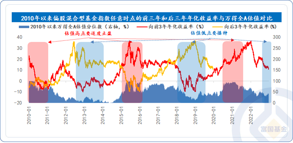 ● 另一方面,当前A股处于估值低位,综合2010年以来偏股混合型基金指数任意时点前3年及后3年年化收益率与万得全A估值对比可以发现,在估值低估区间前后3年收益率表现可以发现,在高估时要适度止盈,估值低点适合播种。